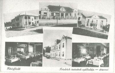 A little history of the Liget Royal Restaurant - a glimpse into the past, part III. Royal Hotel - Hévíz, 1939 The photo taken from the 1932 postcard shows details of the Friedrich hotels and restaurants in Hévíz. The top three images and the bottom center are hotel buildings. Below, on two sides, restaurant interiors can be seen.